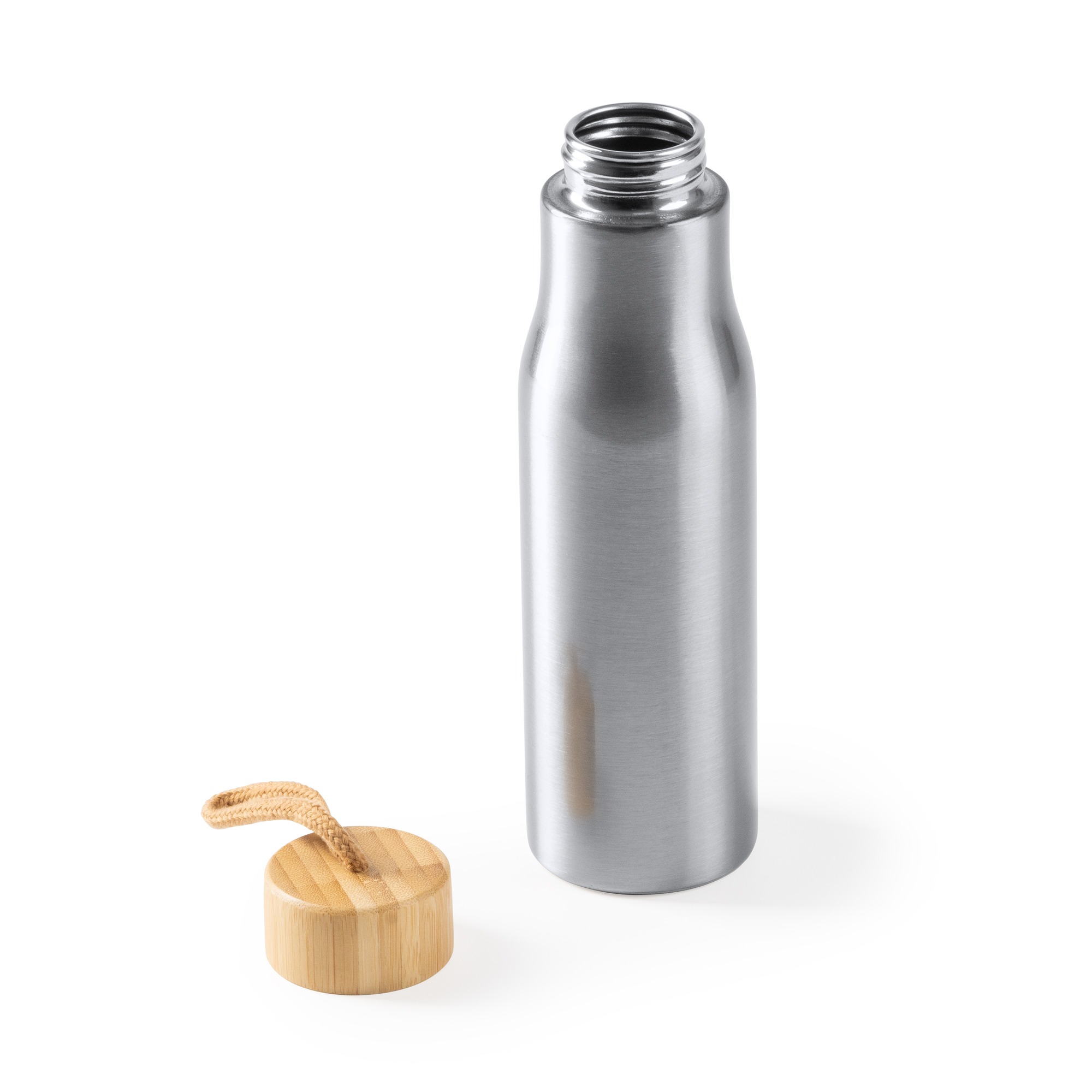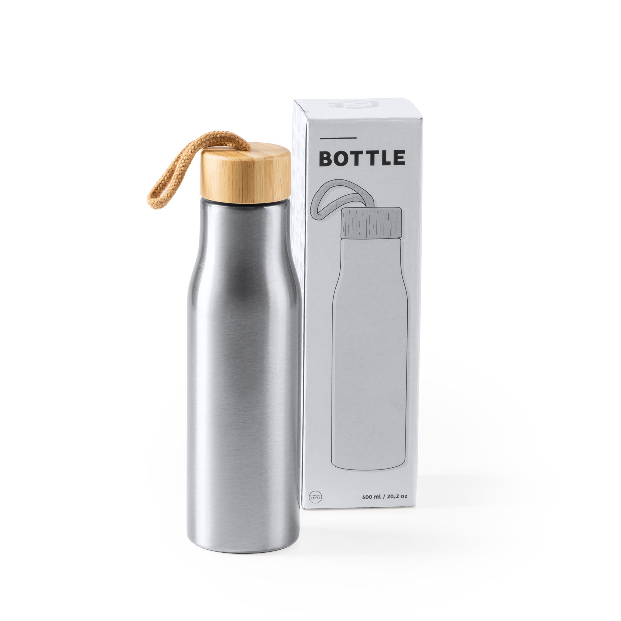 Bottiglia in acciaio inox 304 con coperchio in bambรน. Include tracolla per il trasporto. Capacitร 600 ml. Promuovi la tua azienda con la bottiglia Sotos.