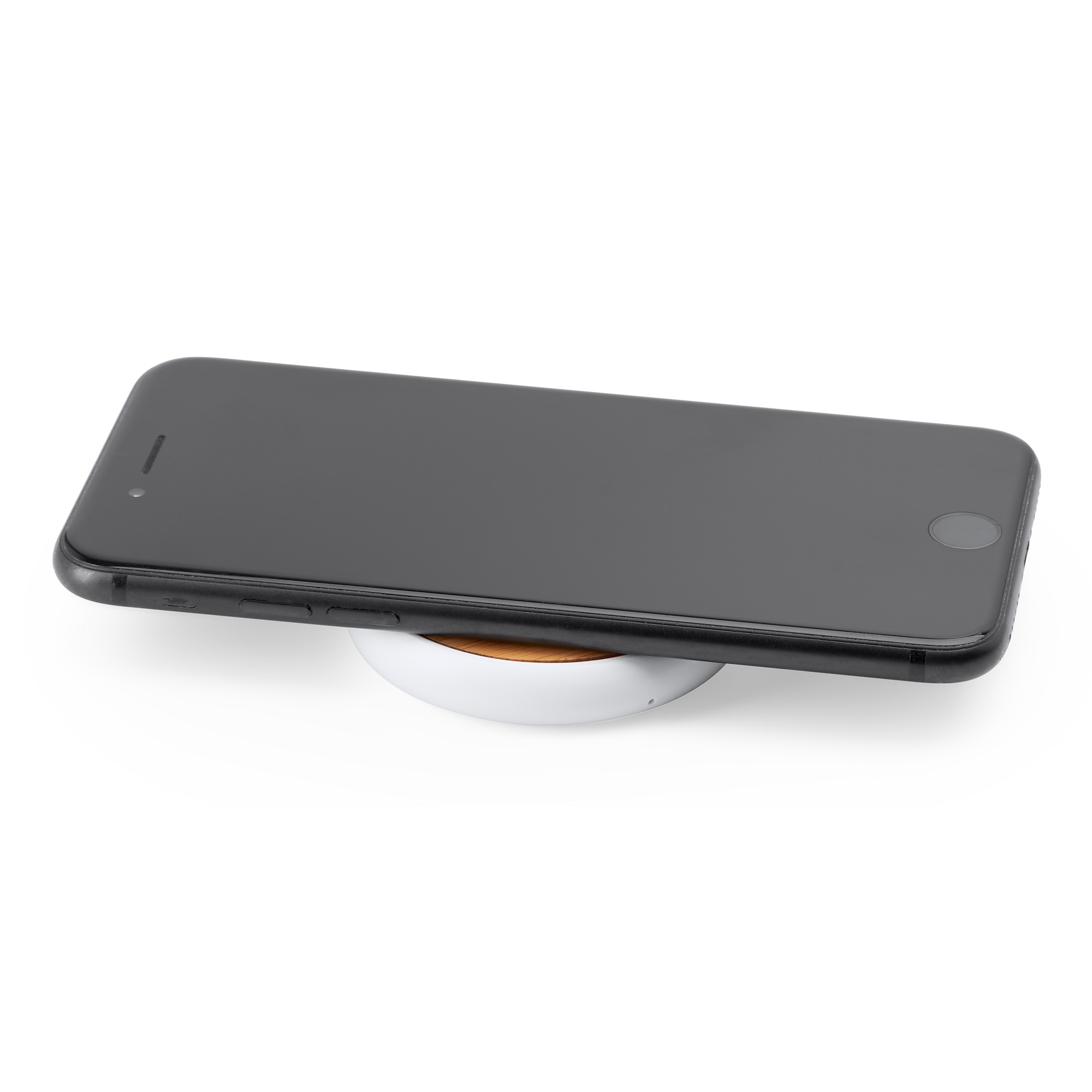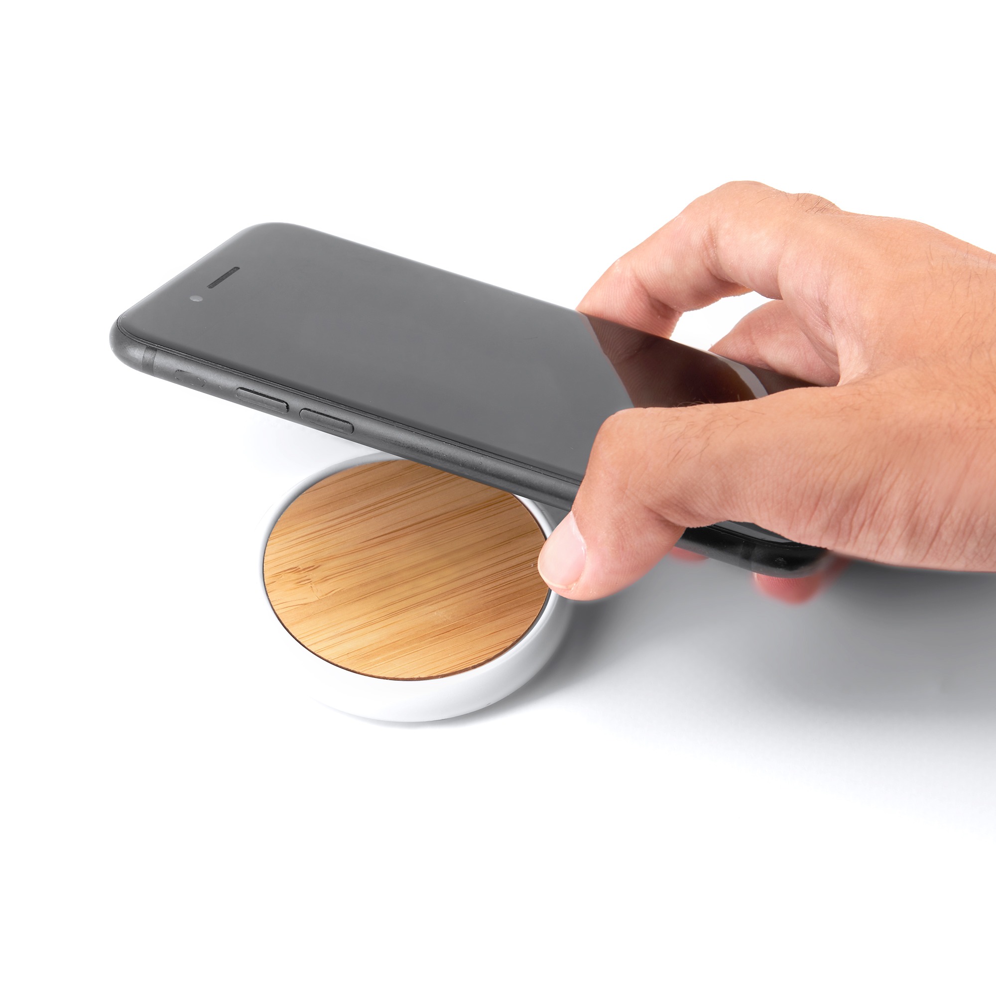 Caricabatterie wireless realizzato con corpo in ABS bianco e superficie in bambรน, con potenza di 5W. Posizionate lo smartphone sopra di esso e lasciatelo in carica. Cavo incluso.