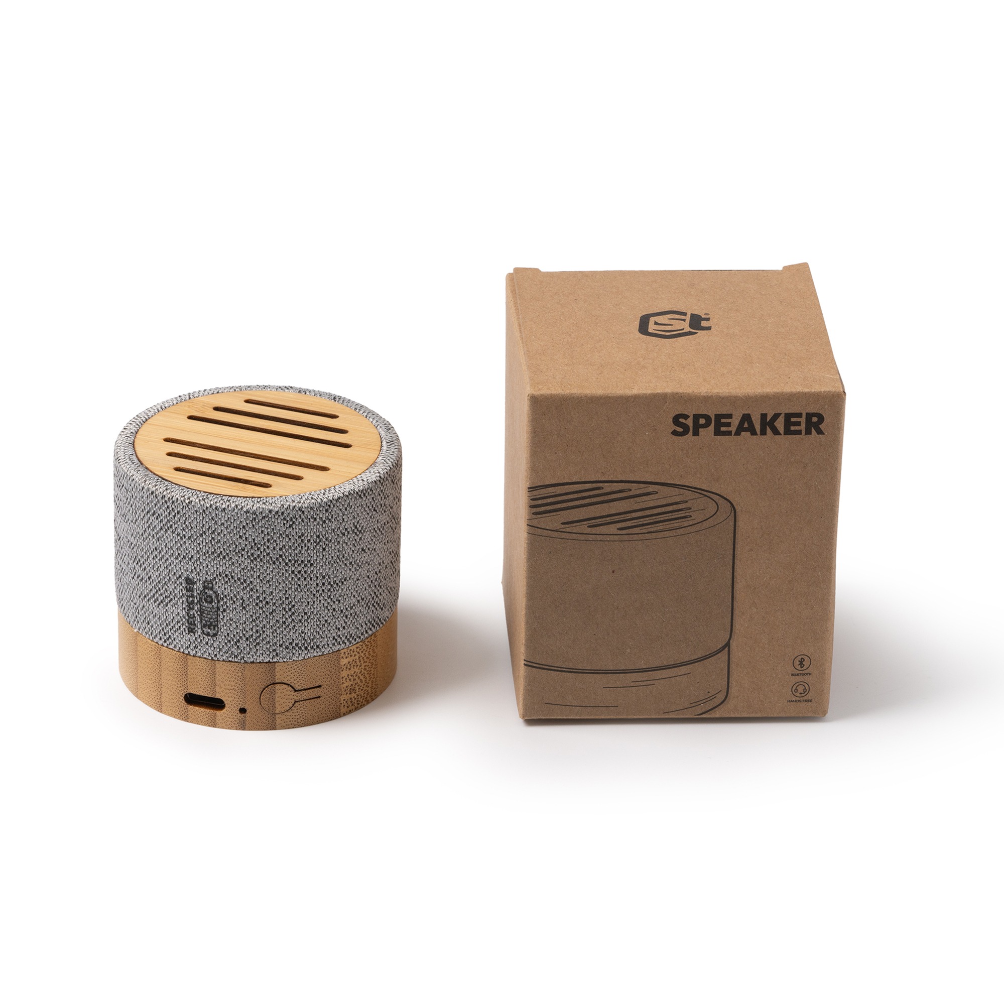 Altoparlante wireless con corpo in bambรน e tessuto RPET di design. Potenza di 3W e batteria ricaricabile. Connessione di tipo C. Cavo incluso. Altoparlante realizzato con materiali ecologici per ridurre le emissioni inquinanti.