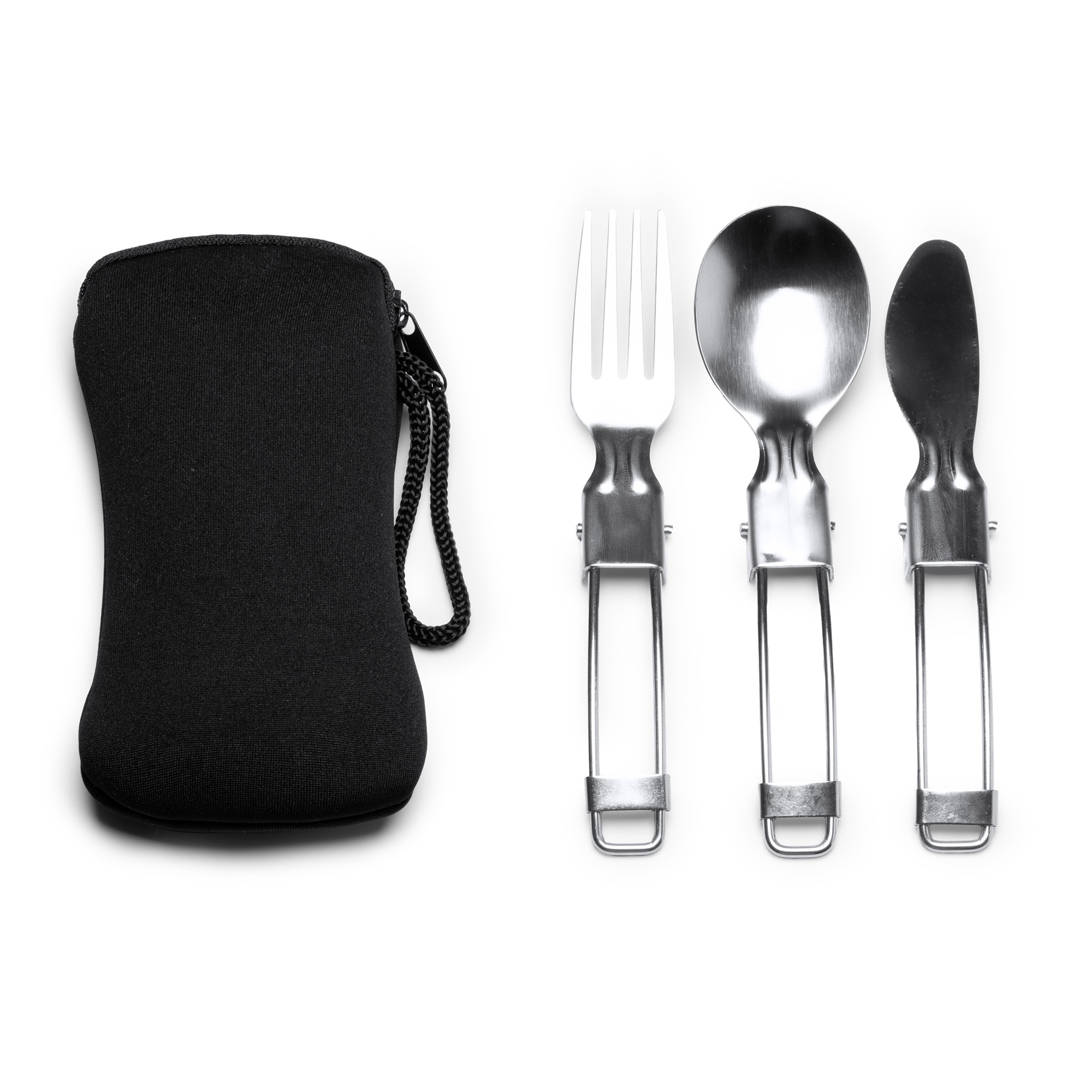 Set di posate pieghevoli in acciaio inox con pratica custodia in neoprene. Include forchetta, coltello e cucchiaio.