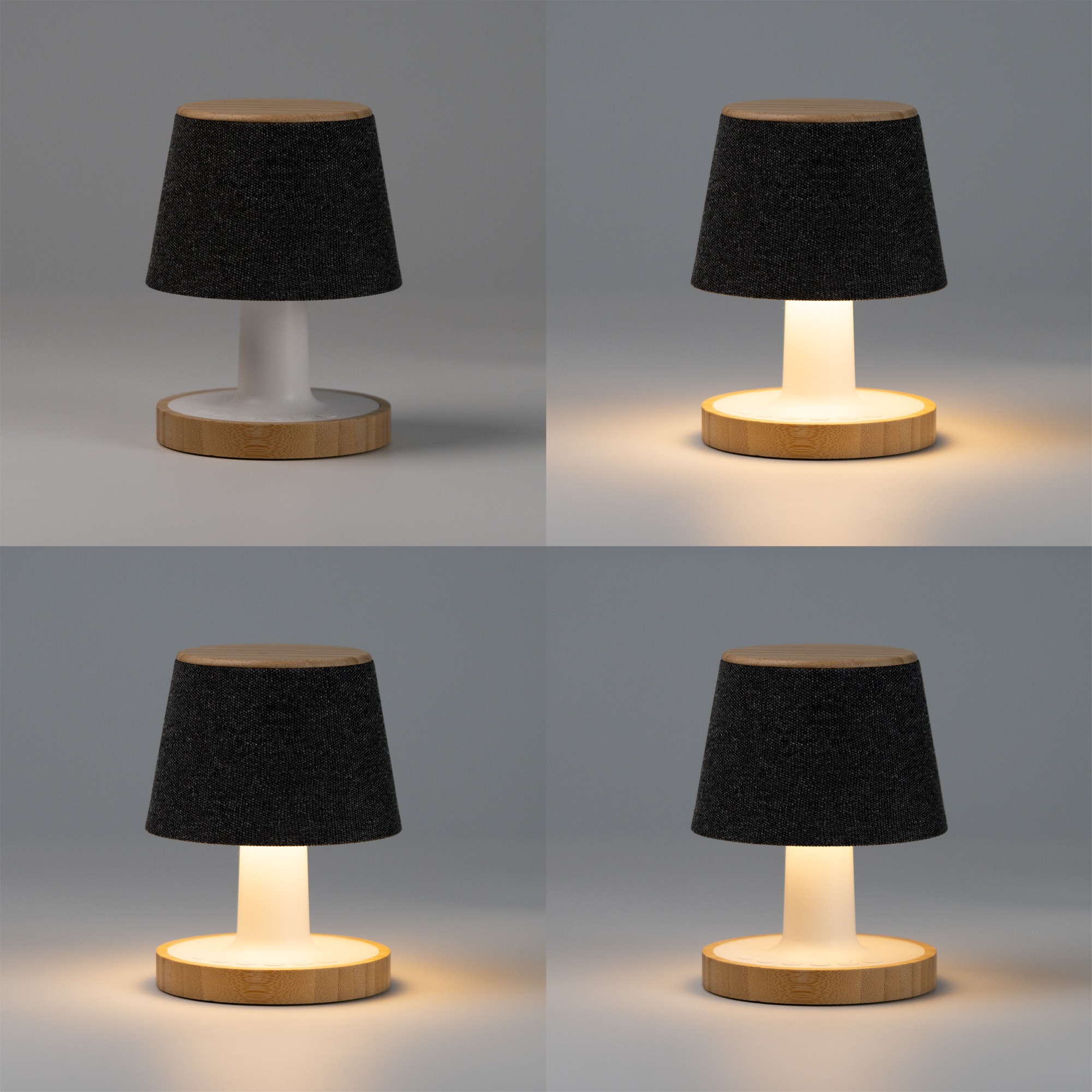 Lampada per altoparlante da 5W in poliestere riciclato con dettagli in bambรน. Modalitร  di illuminazione a LED: bianco, neutro e caldo. L’altoparlante incorpora 6 suoni rilassanti. Include cavo di tipo C. Confezione in scatola con design ecologico