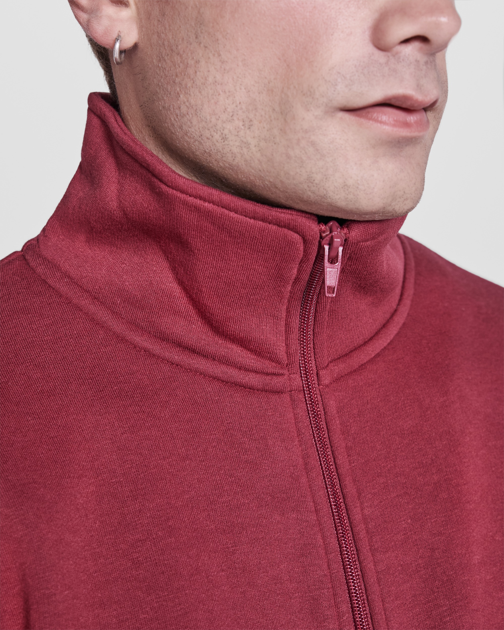 Felpa a collo alto con zip tono su tono. Collo interno dello stesso colore. Copertura delle cuciture rinforzata all’interno del colletto. Costola 1×1 ai polsini e in vita.