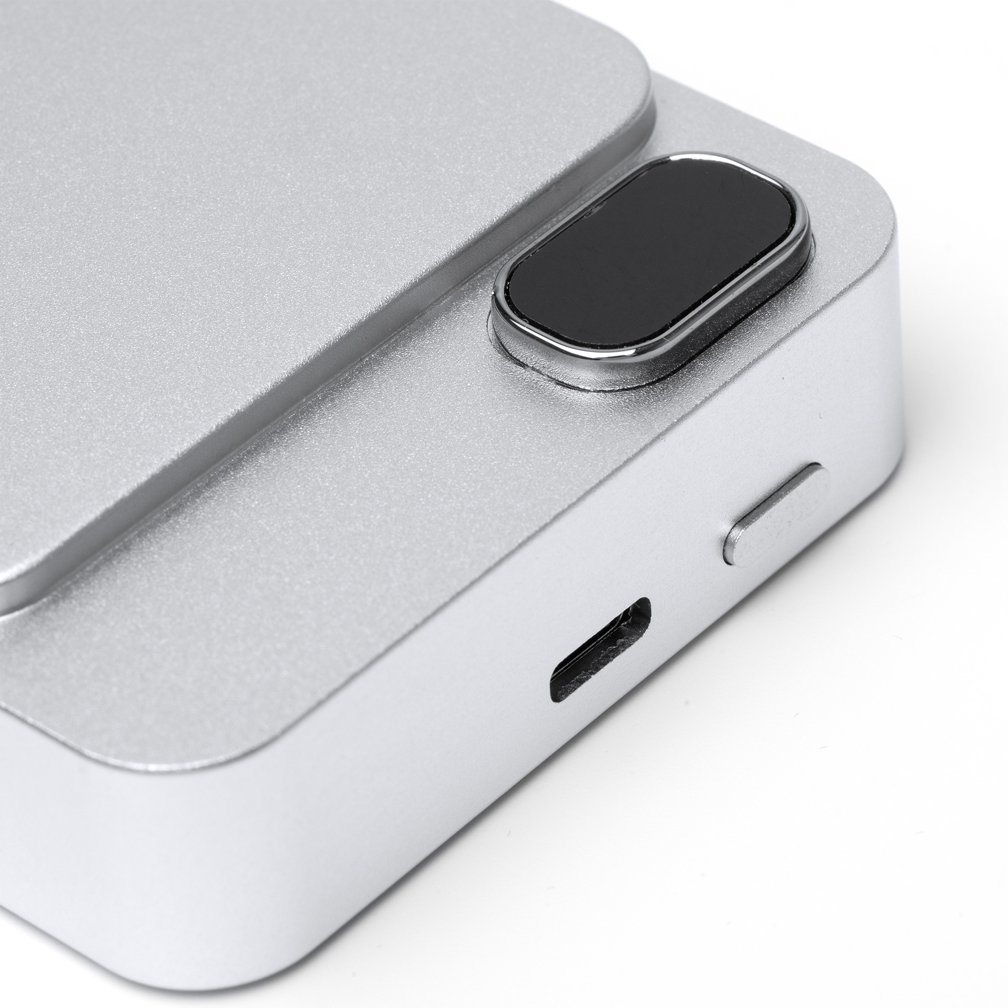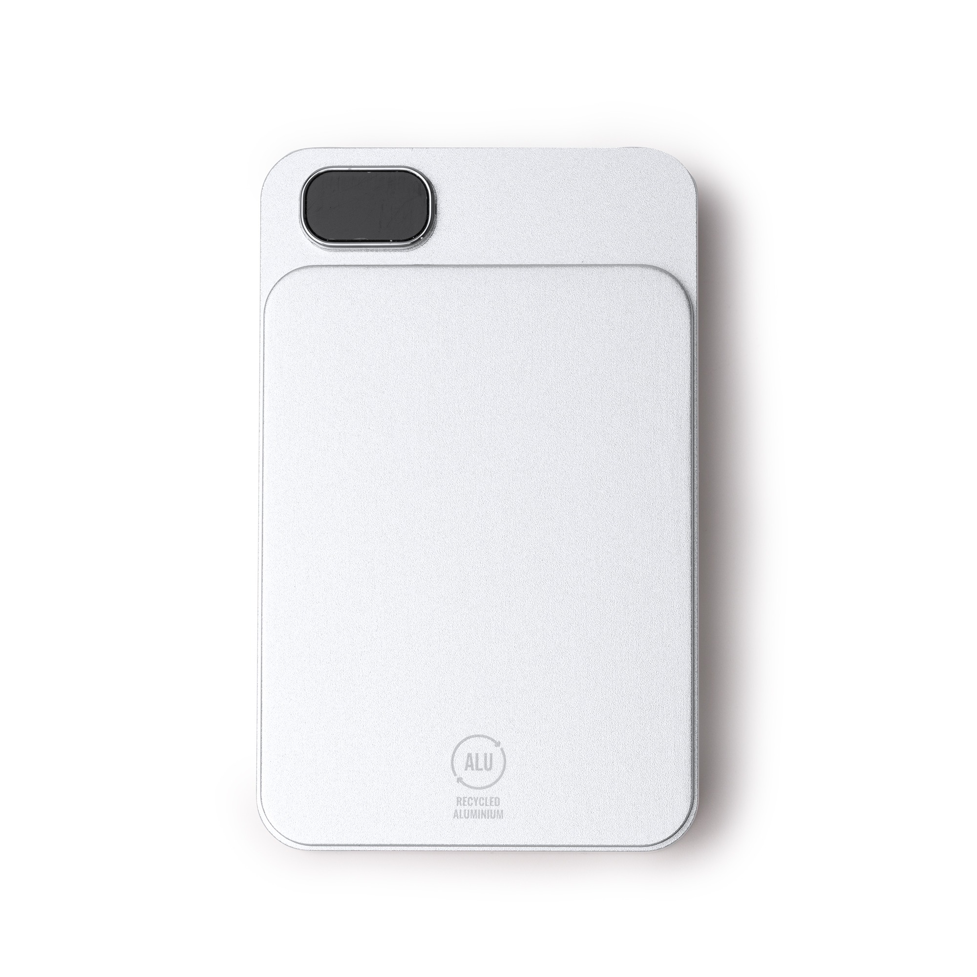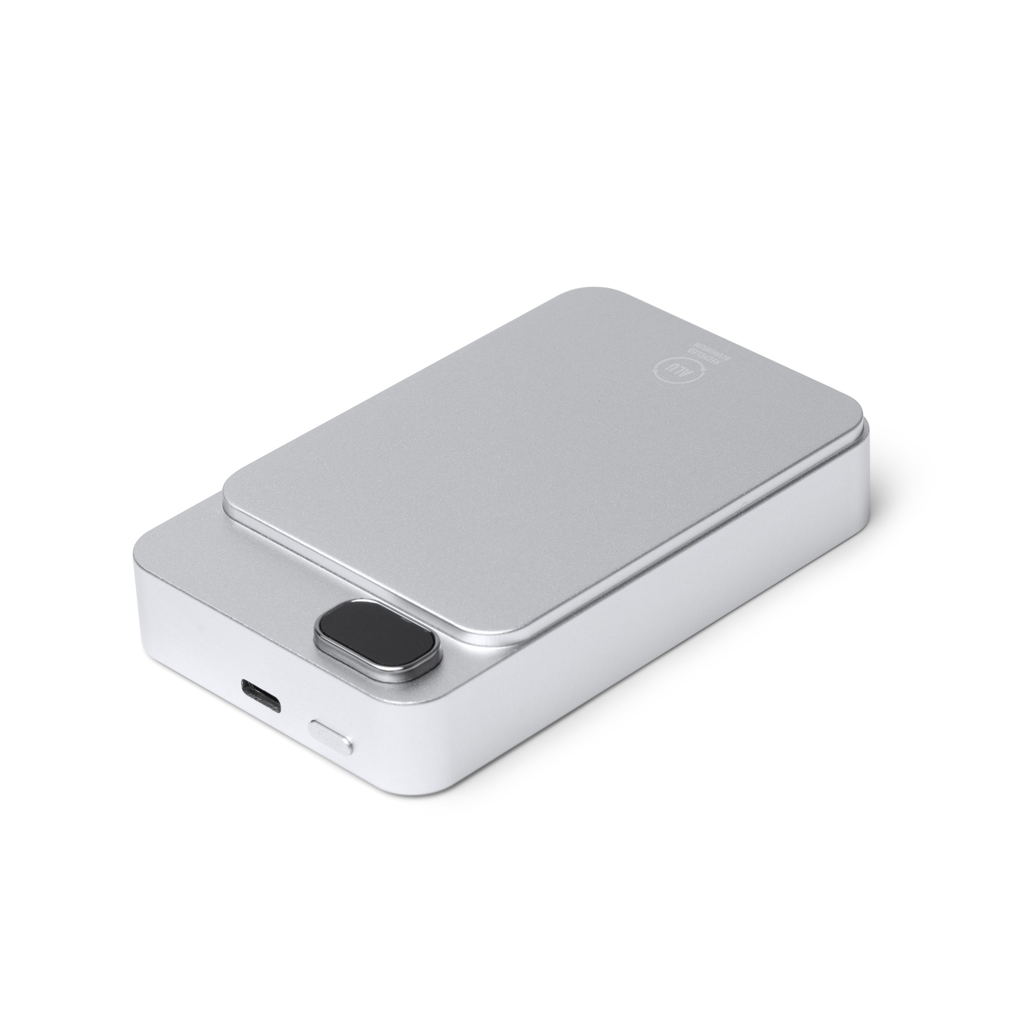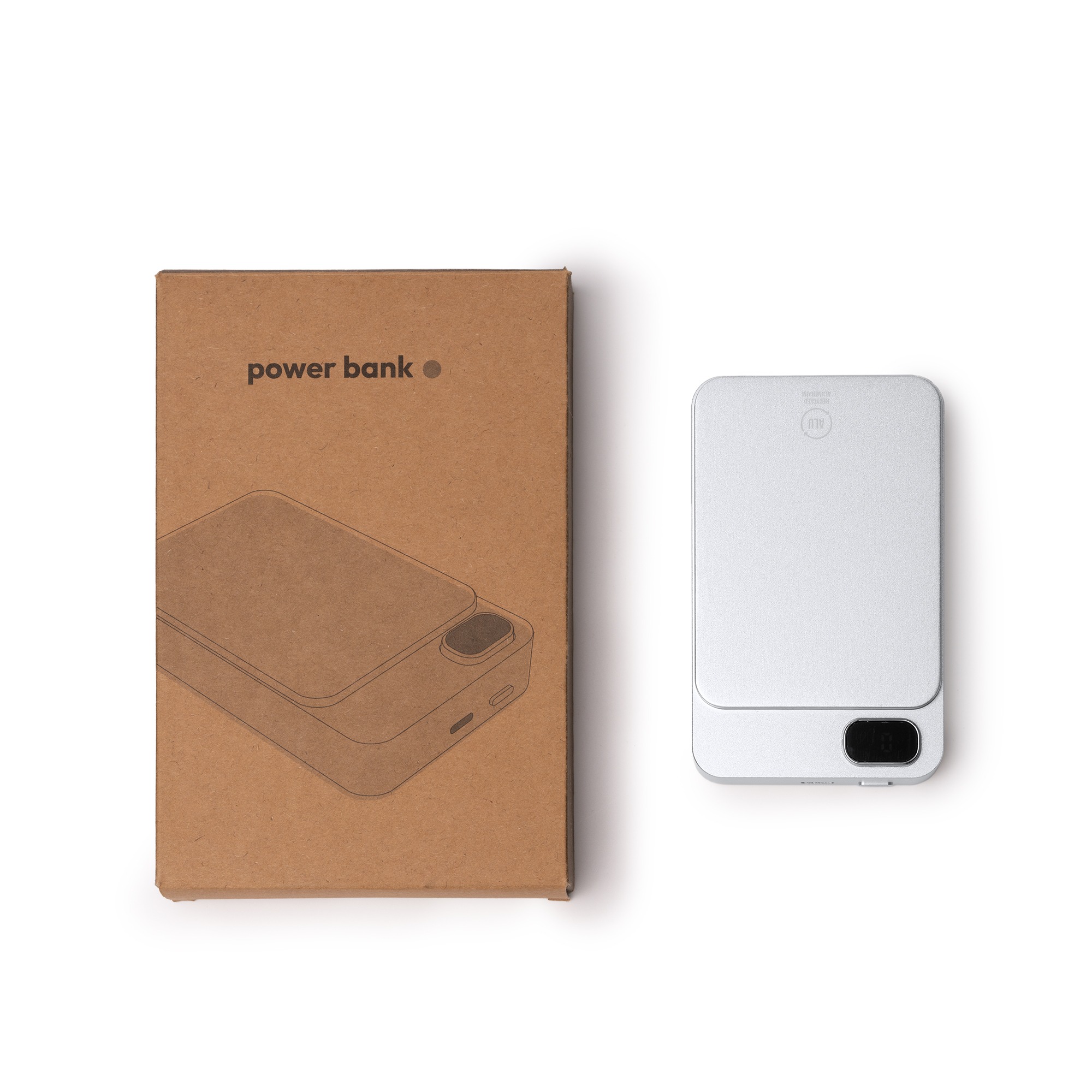 Batteria magnetica esterna da 10000 mAh con funzione di ricarica wireless. Schermata per visualizzare la percentuale di ricarica. Corpo in alluminio riciclato. Corrente dโ€™uscita 15W. Include cavo di tipo C e anello magnetico. Confezione in scatola con design ecologico.