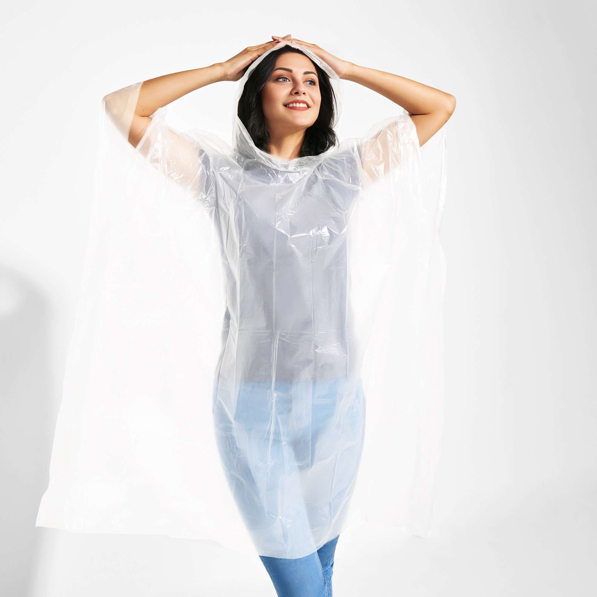 k-way per la pioggia compostabile. Trasparente e in taglia unica per adulti, con cappuccio e apertura per le braccia.