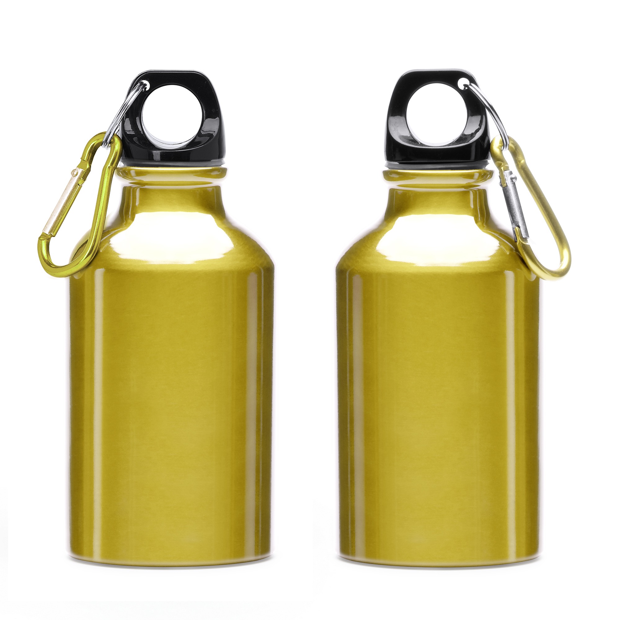 Bottiglia in alluminio con moschettone. Tappo nero e moschettone dello stesso colore metallico della bottiglia. Capacitร 330 ml. Le sue dimensioni consentono di portarla sempre con sรฉ.
